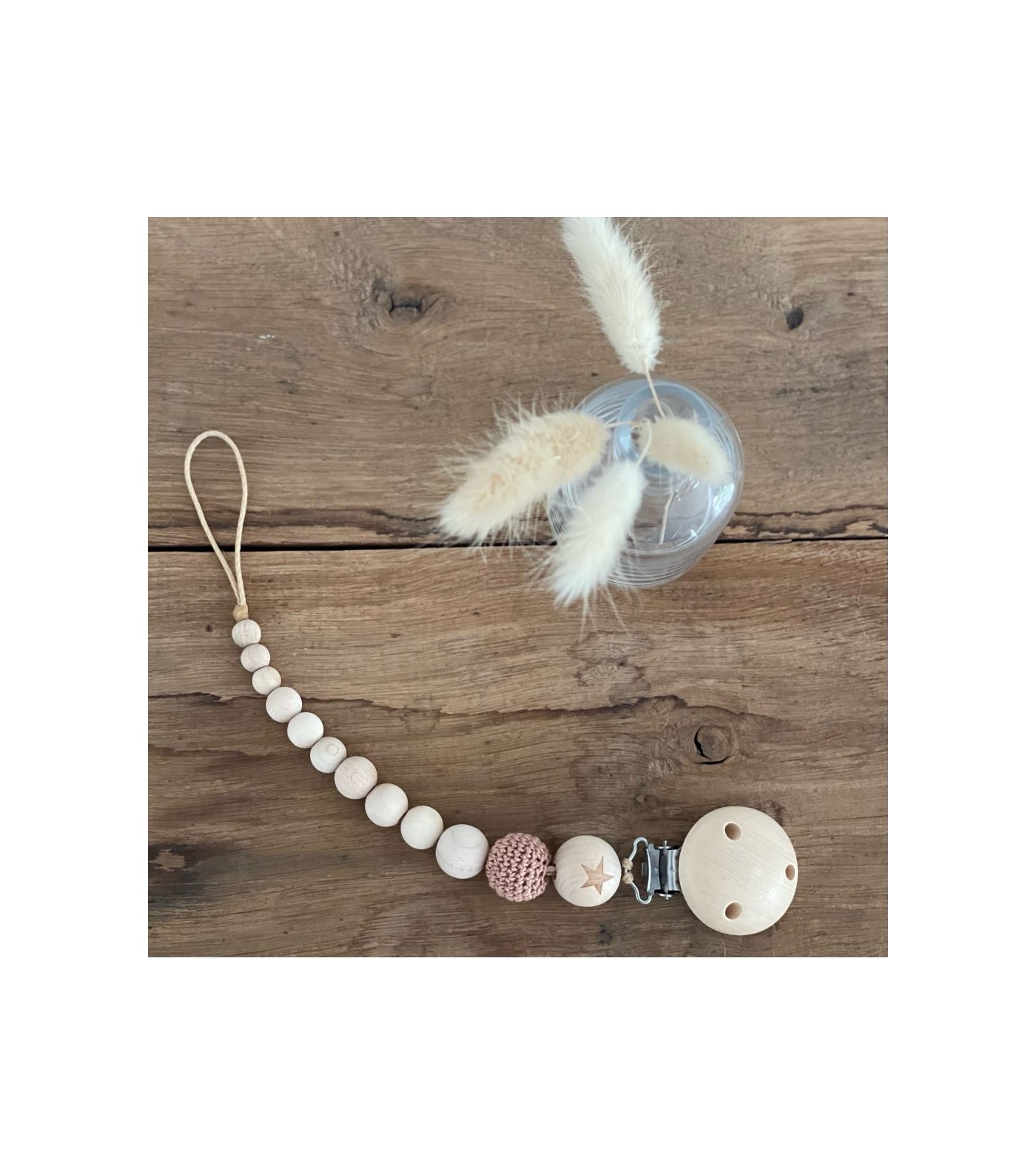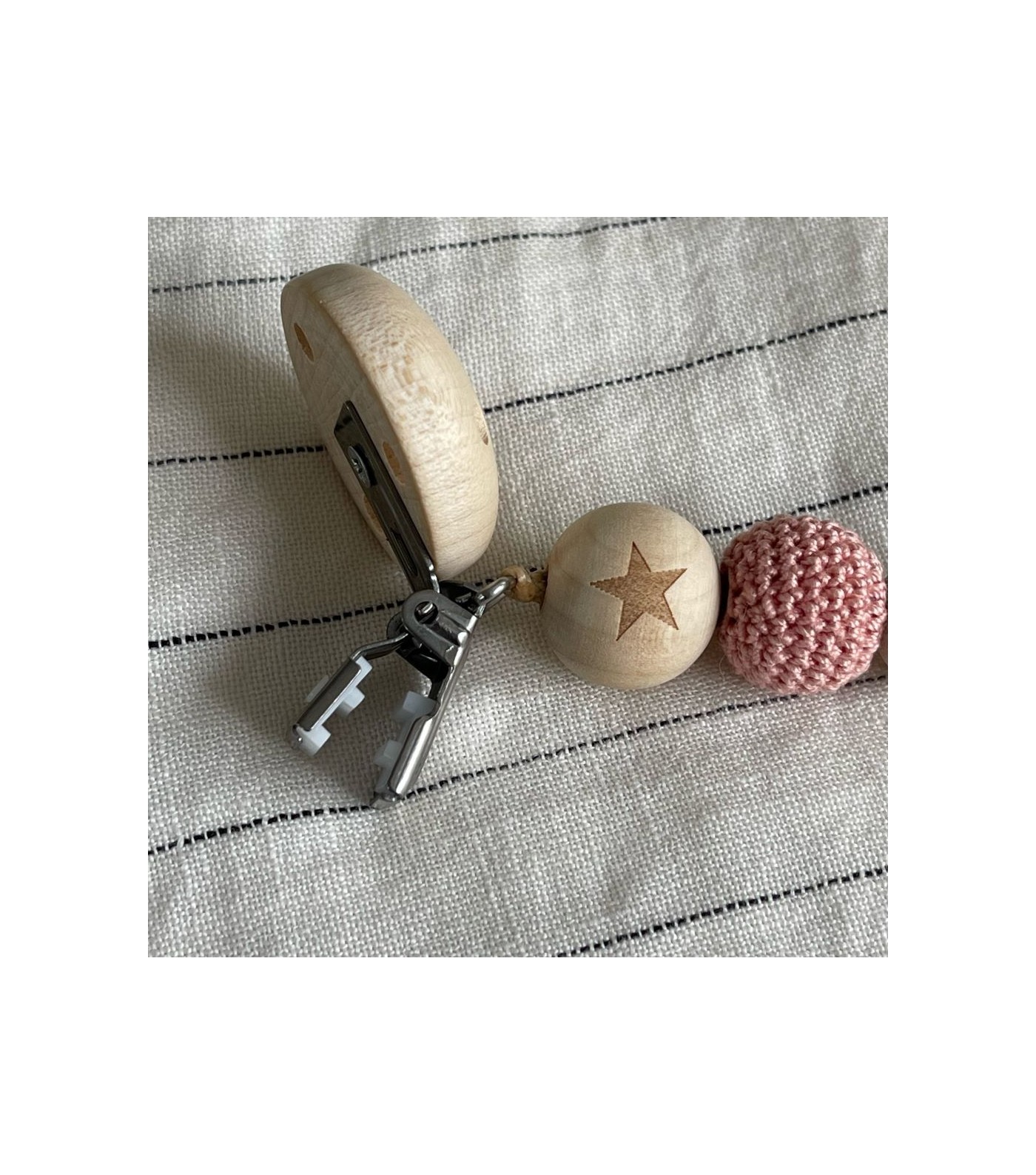 L'accroche doudou adopte un design épuré, mettant en valeur la beauté du bois naturel. La boule couleur terracotta en crochet ajoute une touche stylée et originale à l'ensemble, créant un équilibre parfait entre fonctionnalité et esthétique.