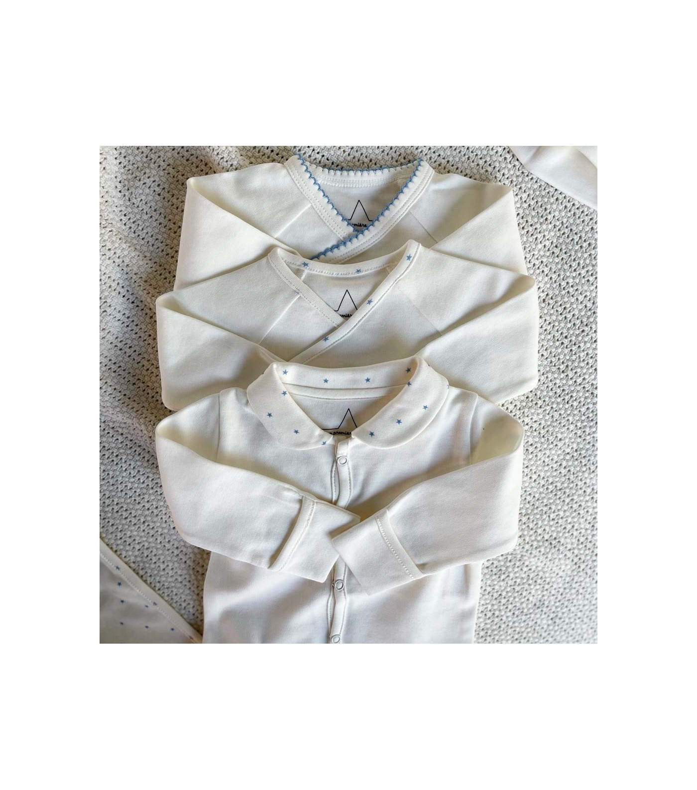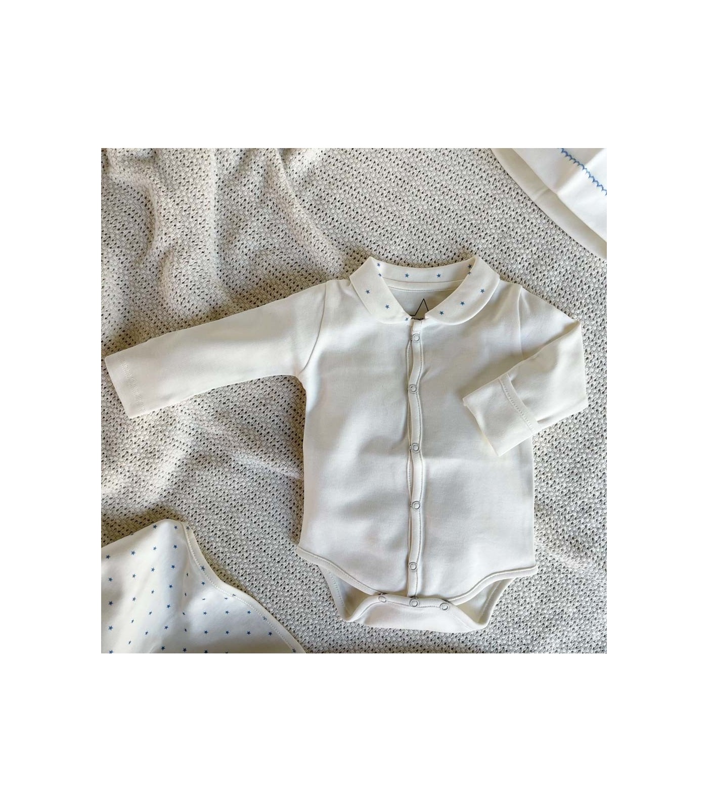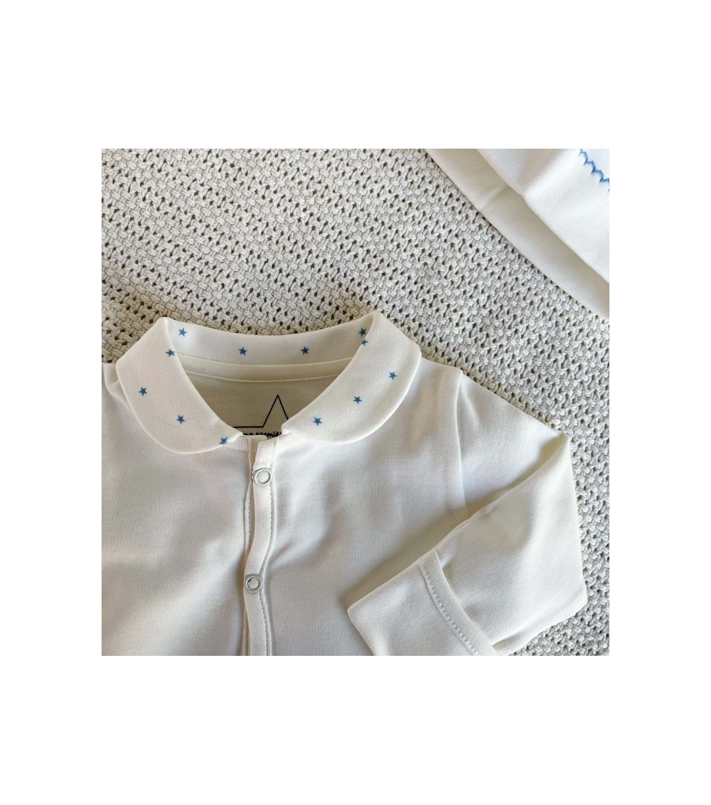 Alliant élégance et confort, ce modèle dispose d'une fermeture pratique à boutons-pression, simplifiant le change. Son design épuré est rehaussé de fines étoiles bleues au niveau du col, ajoutant une touche délicate.
