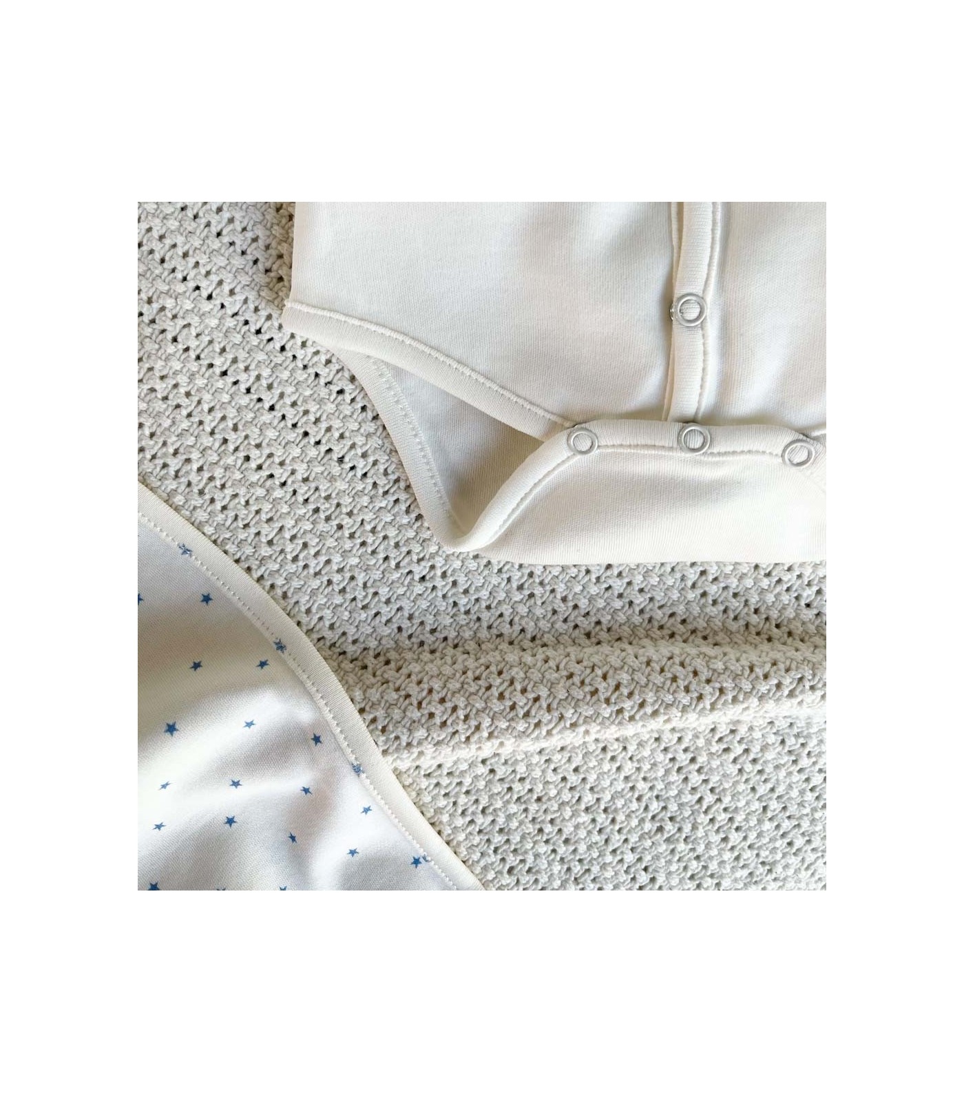 Simple et raffiné, ce body en 100% coton bio dispose de délicates étoiles bleues sur le col ainsi que de moufles anti-griffures.