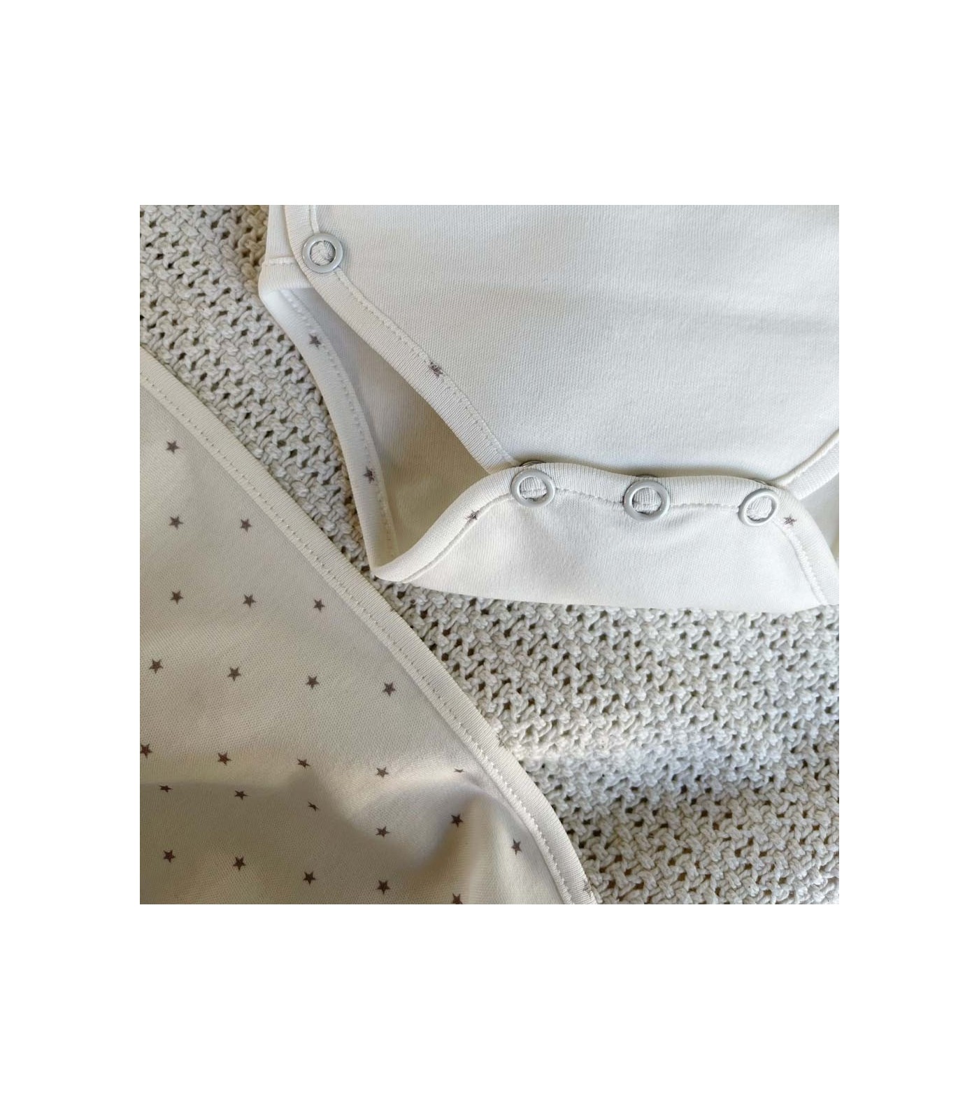 Très joli body manches longues, 100% coton bio, orné de délicates étoiles grises au niveau des coutures.