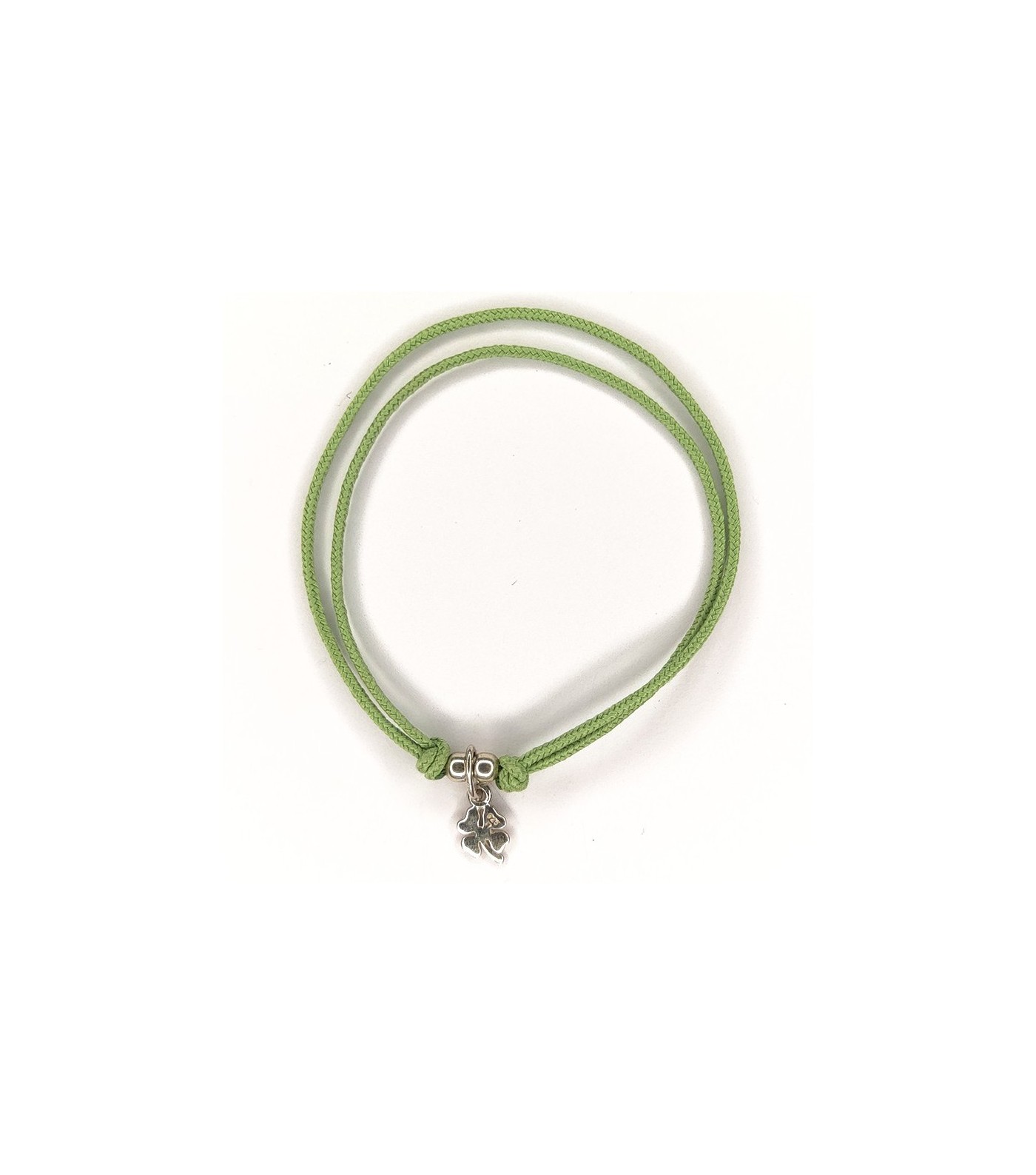 Arborez un joli trèfle en argent délicatement suspendu à un cordon vert pastel, créant ainsi un bijou tendre et symbolique pour votre tout-petit.