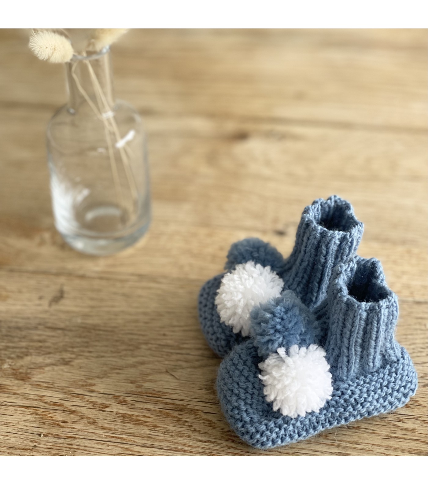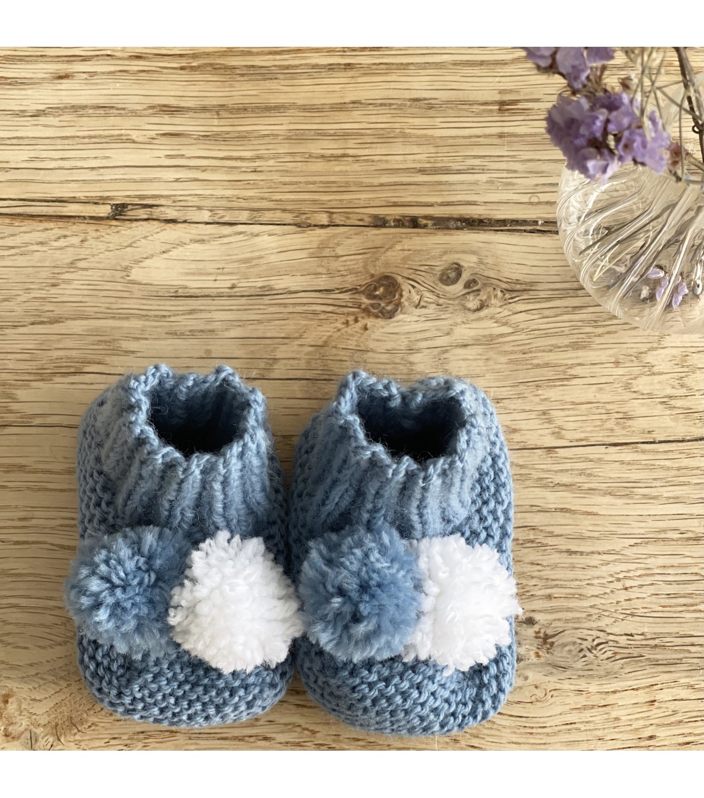 Un Style Unique : Ces chaussons ne sont pas seulement fonctionnels, mais aussi élégamment décorés de pompons bleus, ajoutant une touche ludique et unique à la tenue de votre bébé. Parfaits pour composer la valise de maternité, ils apportent une dose de style dès les premiers jours de vie.
