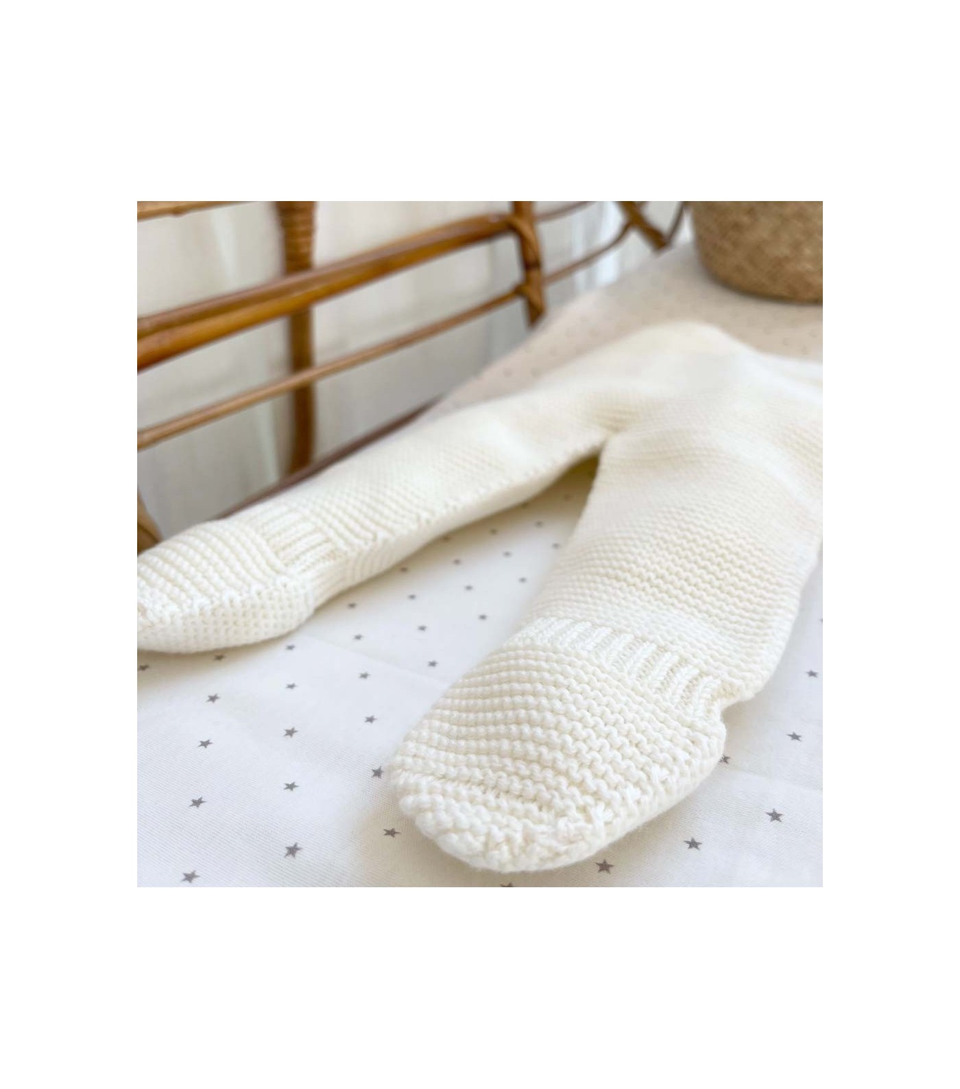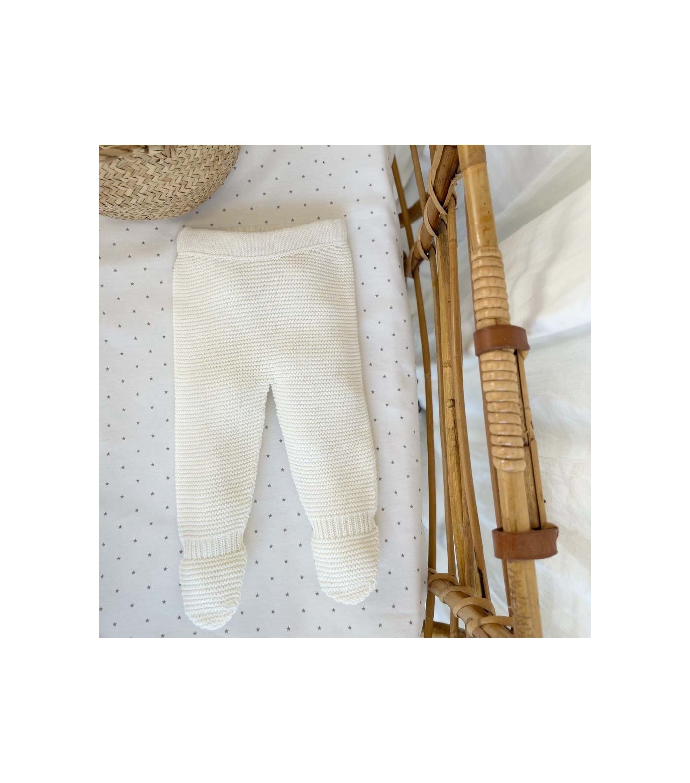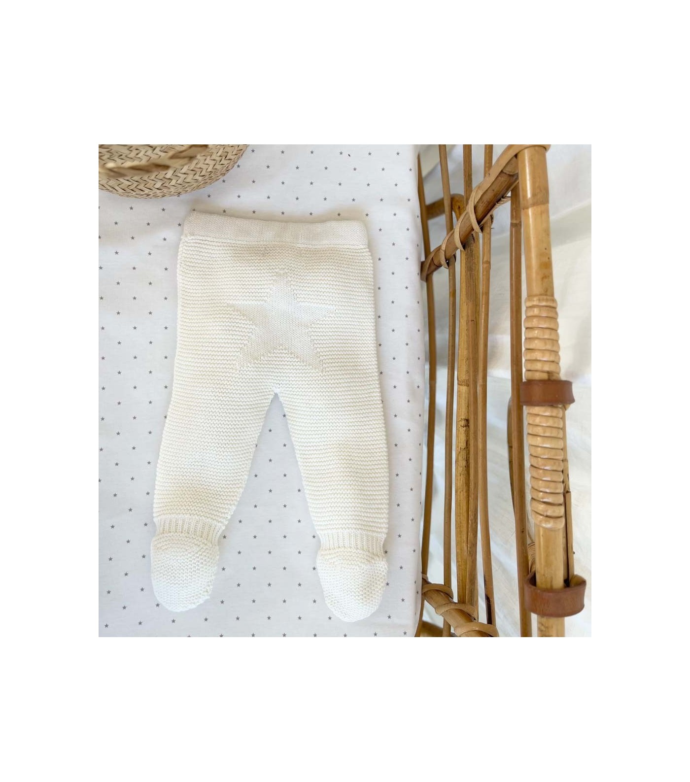 Ce joli pantalon nouveau-né, en 20% laine et 80% coton, est doté d'une étoile en maille retournée sur les fesses.