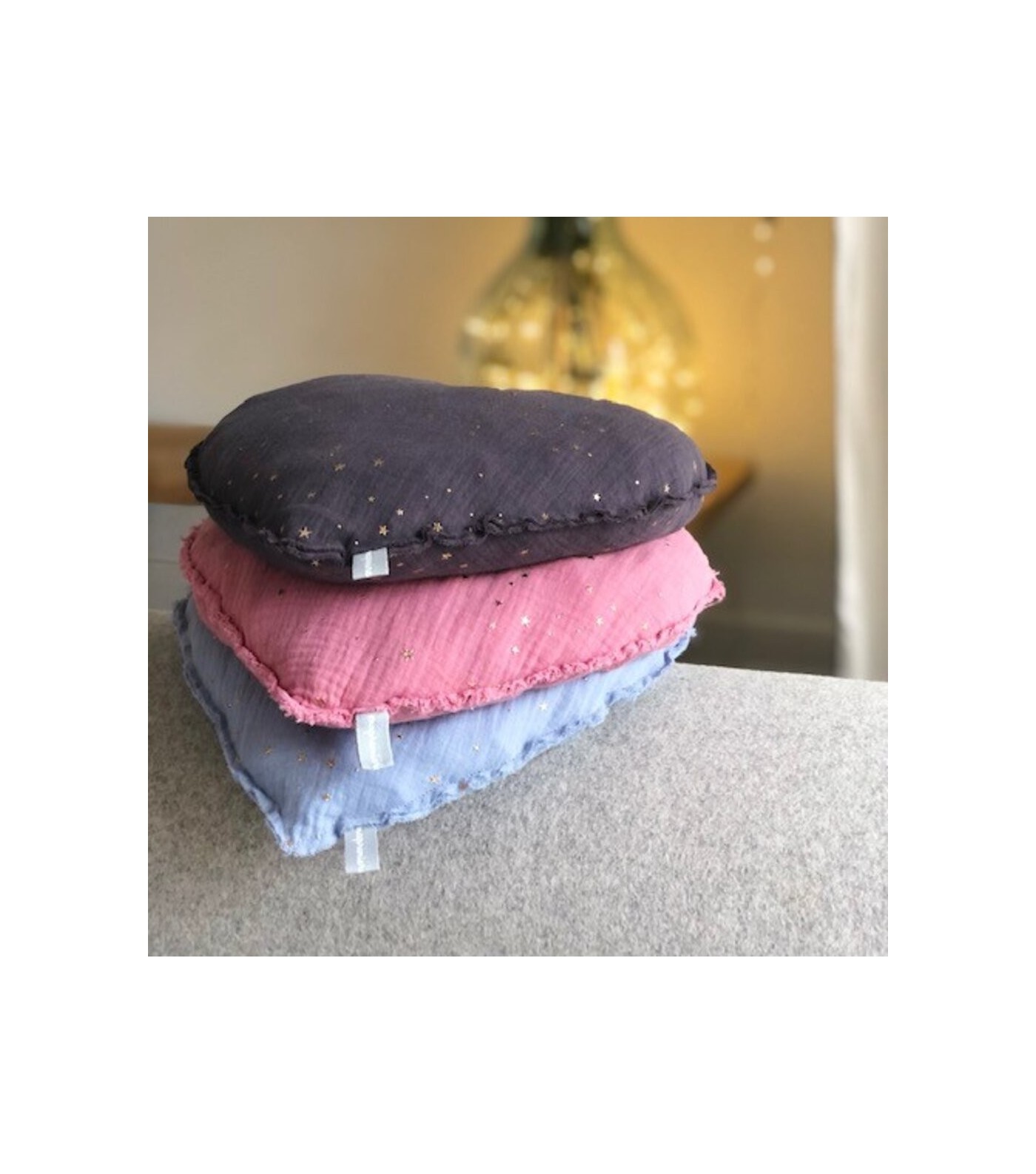Les étoiles dorées ajoutent une touche magique, faisant de ce coussin un élément incontournable pour créer un espace chaleureux et tendre.