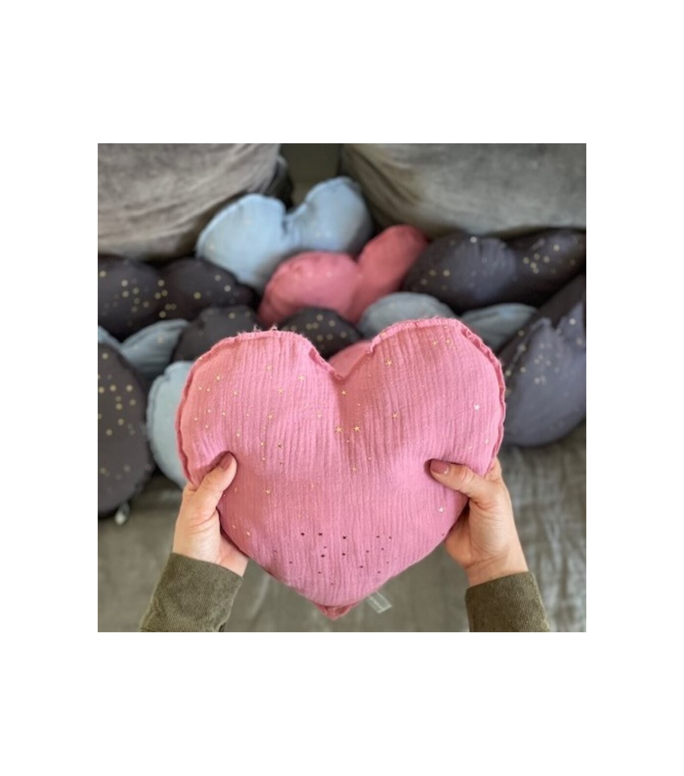 Explorez la magie de notre tout nouveau COUSSIN COEUR ROSE parsemé d'étoiles dorées, une véritable perle décorative pour bercer la chambre de votre petit trésor.