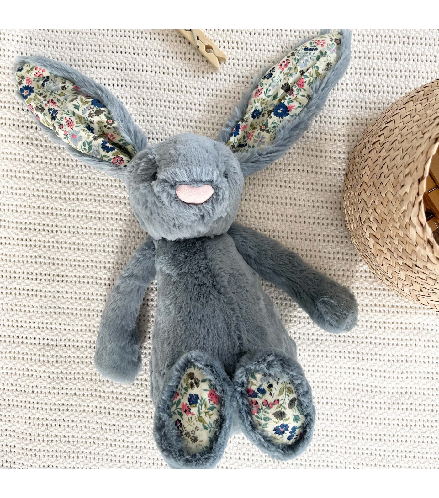 On craque pour le doudou lapin bleu pétrole à l'imprimé liberty.