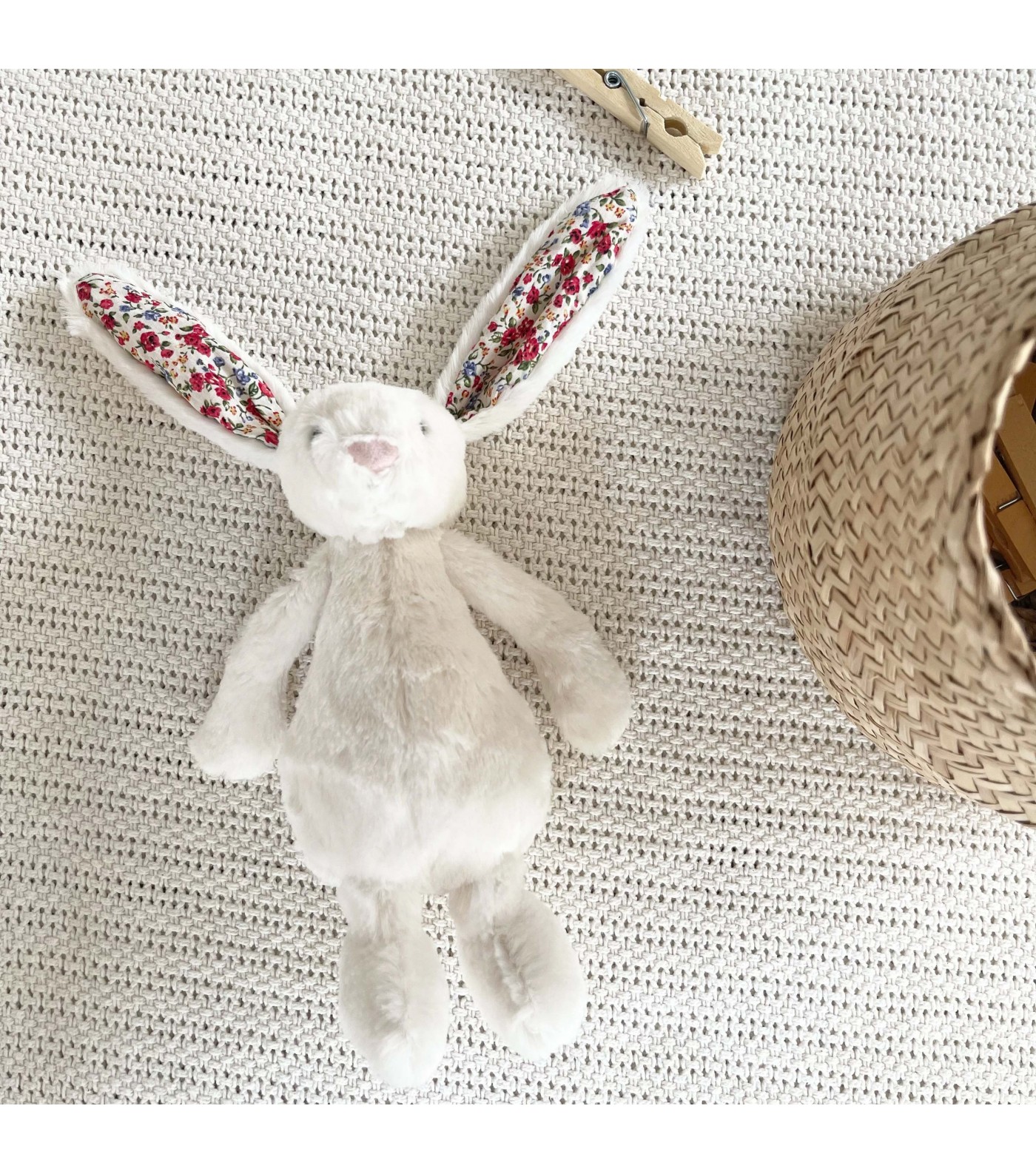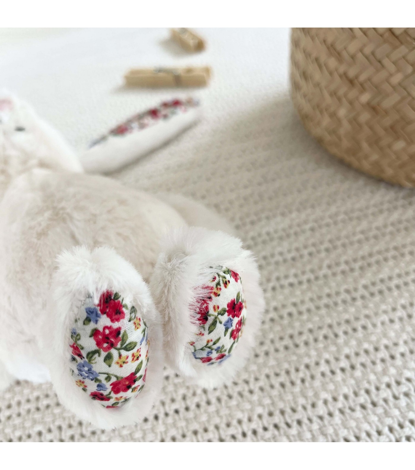 Le doudou lapin blanc liberty est une délicate peluche conçue pour être le compagnon idéal de votre nouveau-né. Son design charmant, agrémenté d'un motif liberty délicat, et sa fourrure douce et soyeuse en font un choix unique et original pour accompagner votre bébé dans ses premiers moments.