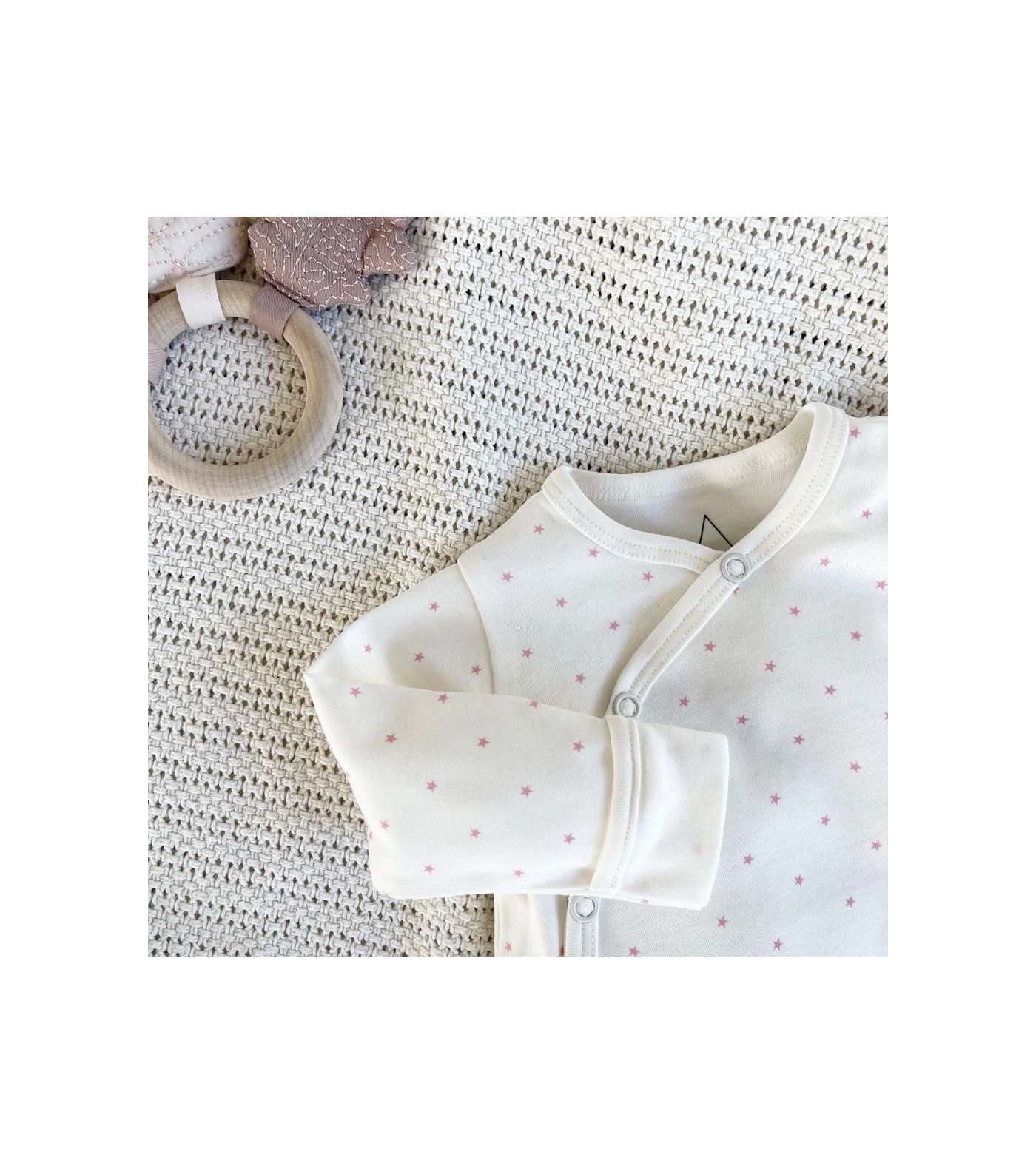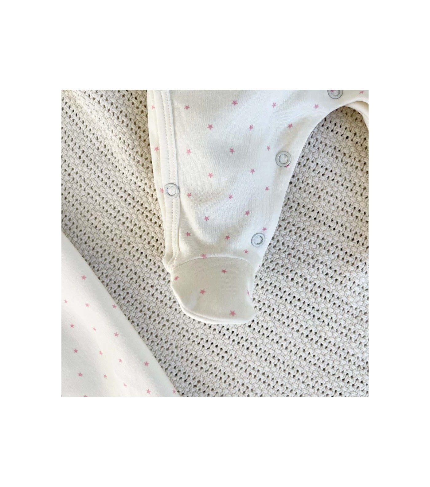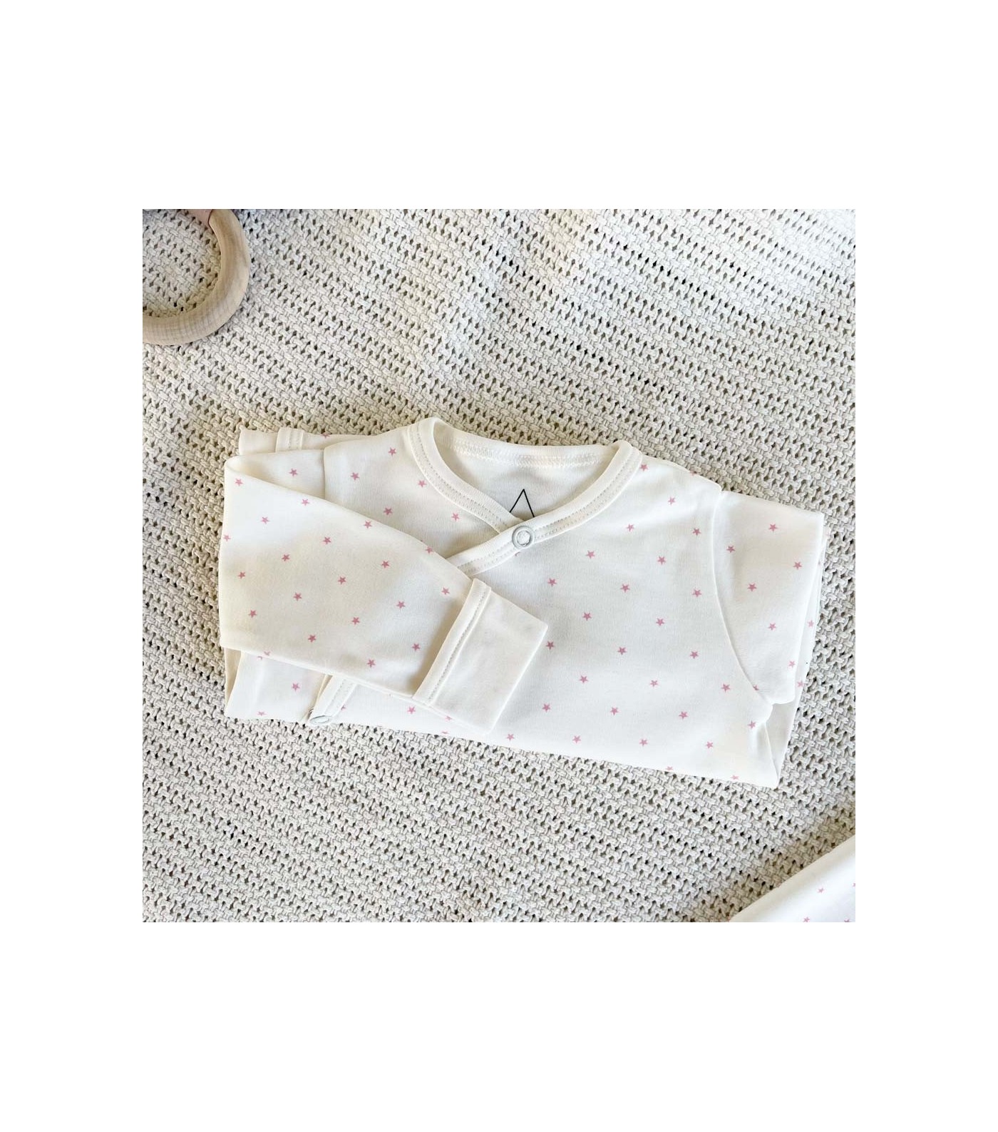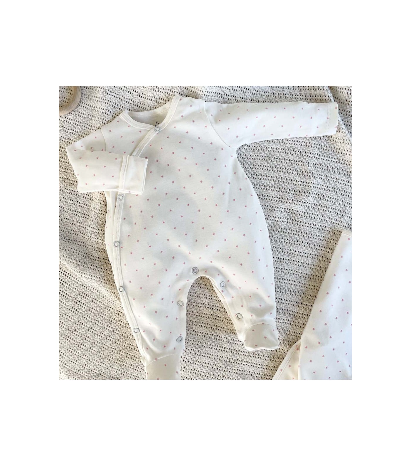 Élégant pyjama 100% coton bio avec ses fines étoiles rose. Ouverture, à boutons pressions, sur le devant et au niveau de l'entre-jambe pour changer votre bébé plus facilement.
