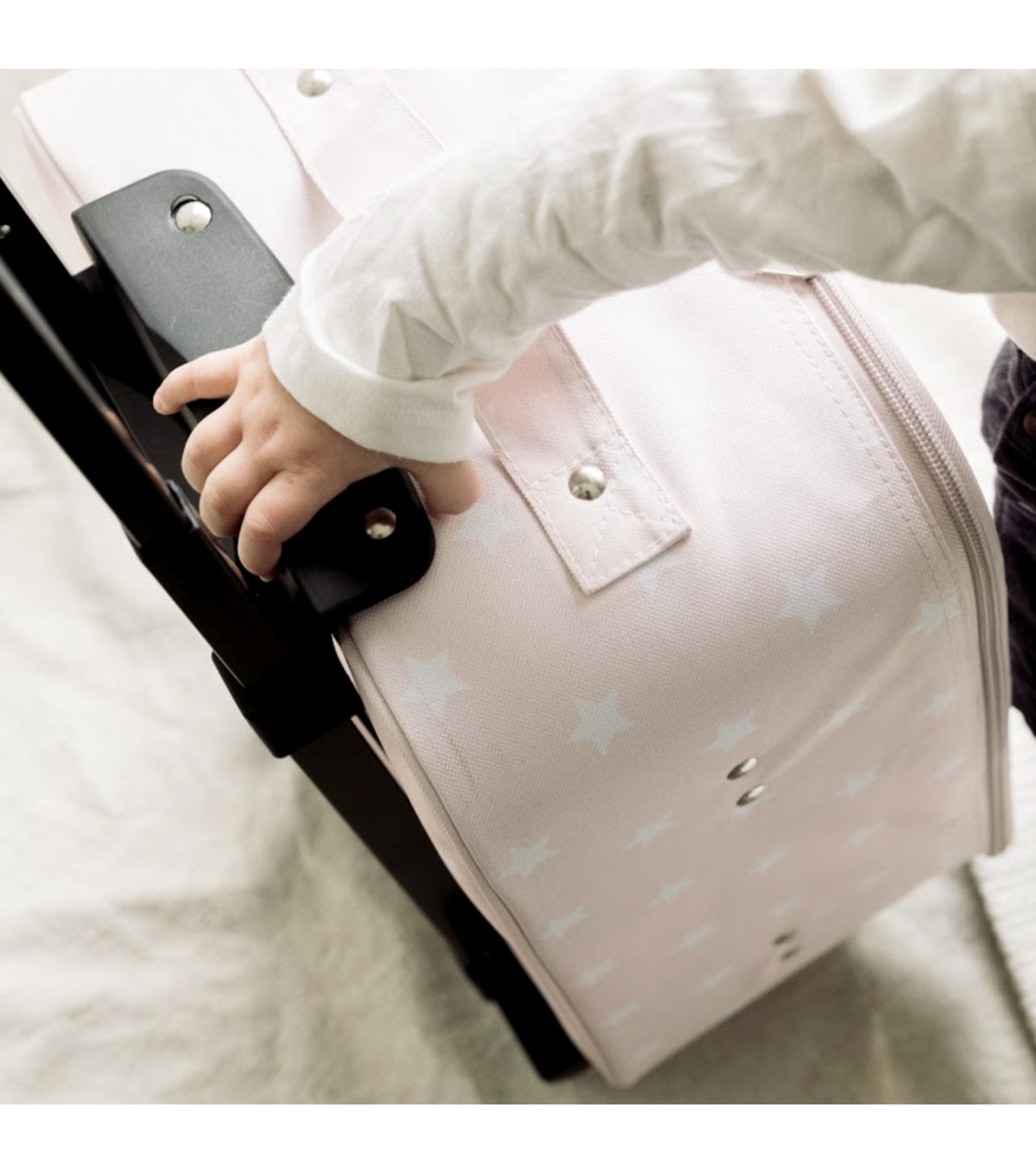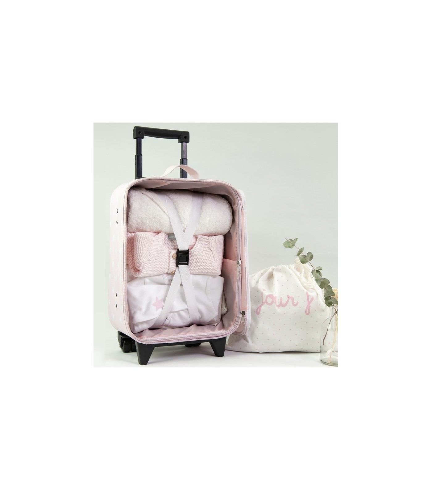 Doublure Rose en Polyester : À l'intérieur, la valise est entièrement doublée d'un tissu polyester rose, offrant un environnement doux pour les affaires de bébé.
