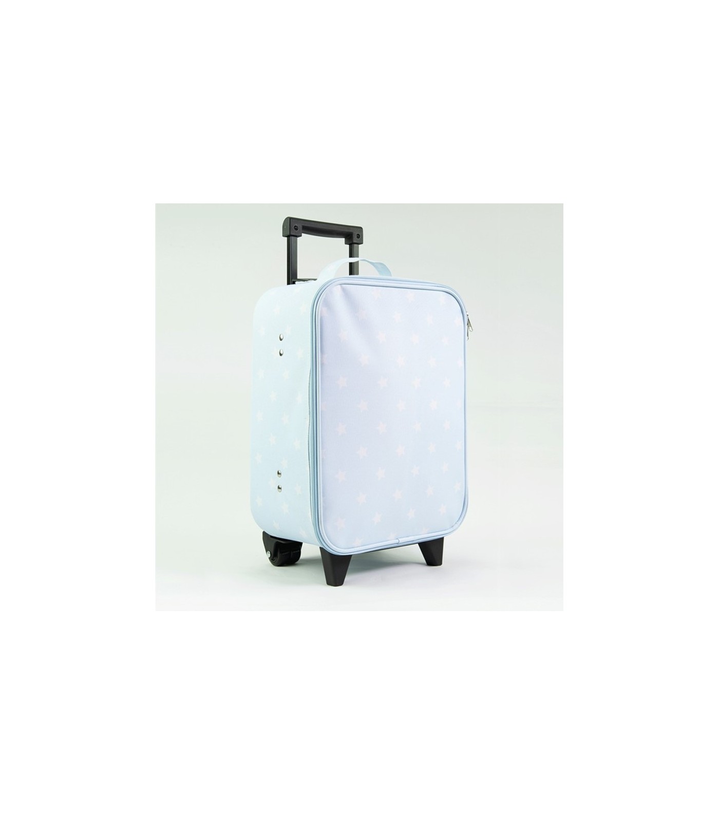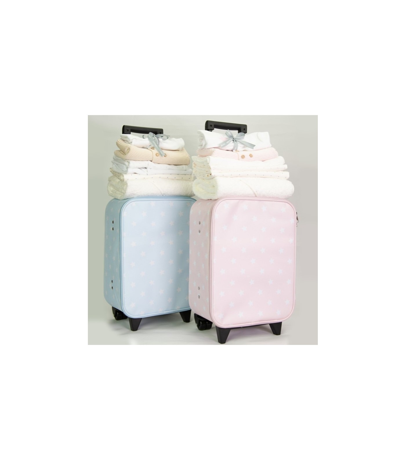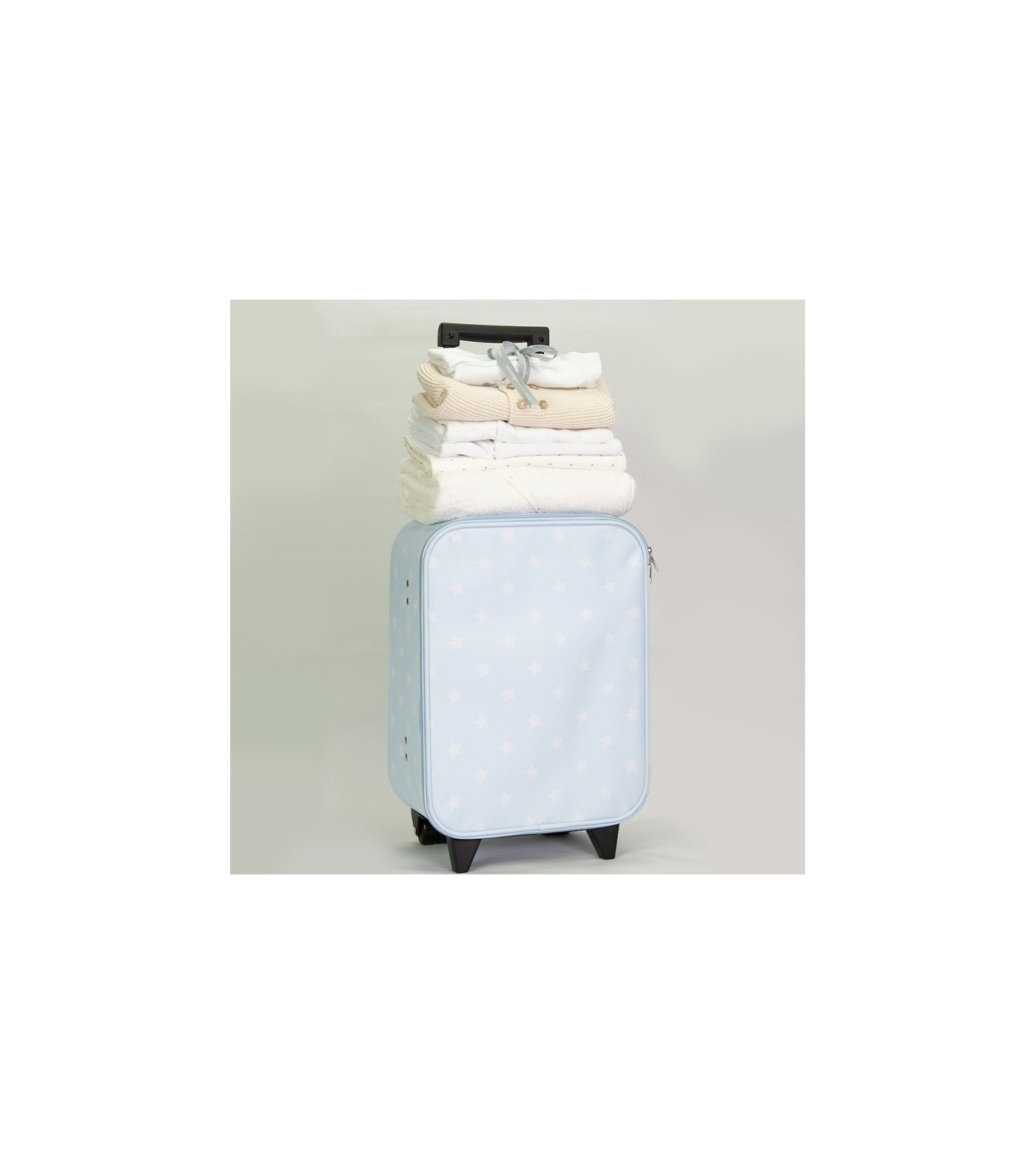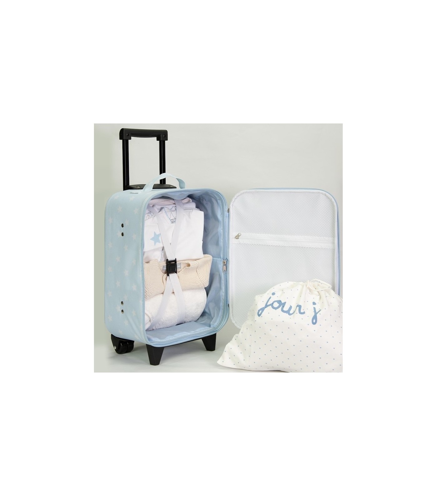 Valise maternité, bleu ciel étoiles blanches, qui est symboliquement la 1ère valisettette de votre petit garçon et deviendra son futur accessoire de voyage. Porte-clé personnalisé au prénom de l'enfant.